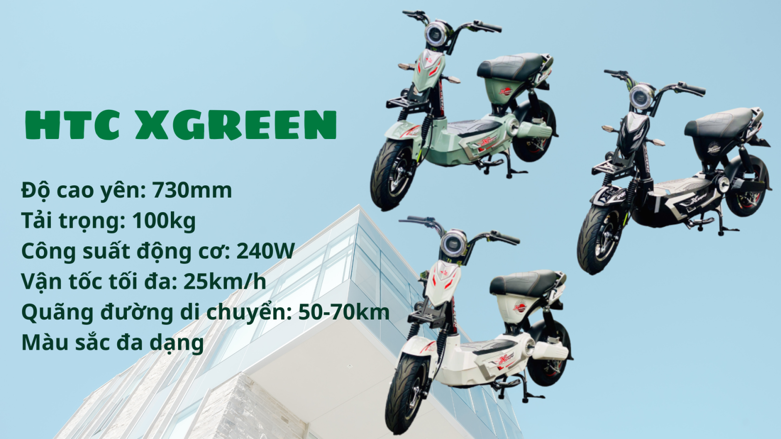 HTC XGreen có thiết kế cá tính với nhiều màu sắc. Động cơ 48V – 240 W nhưng vẫn đảm bảo sự mạnh mẽ khi tăng tốc và di chuyển.
